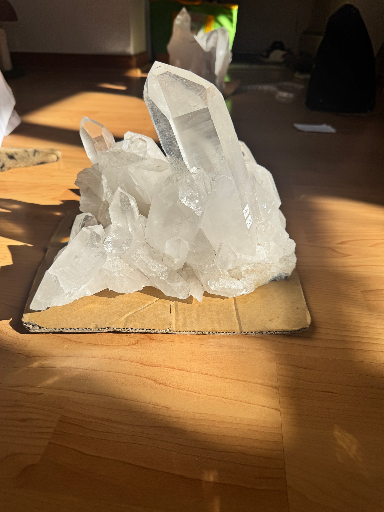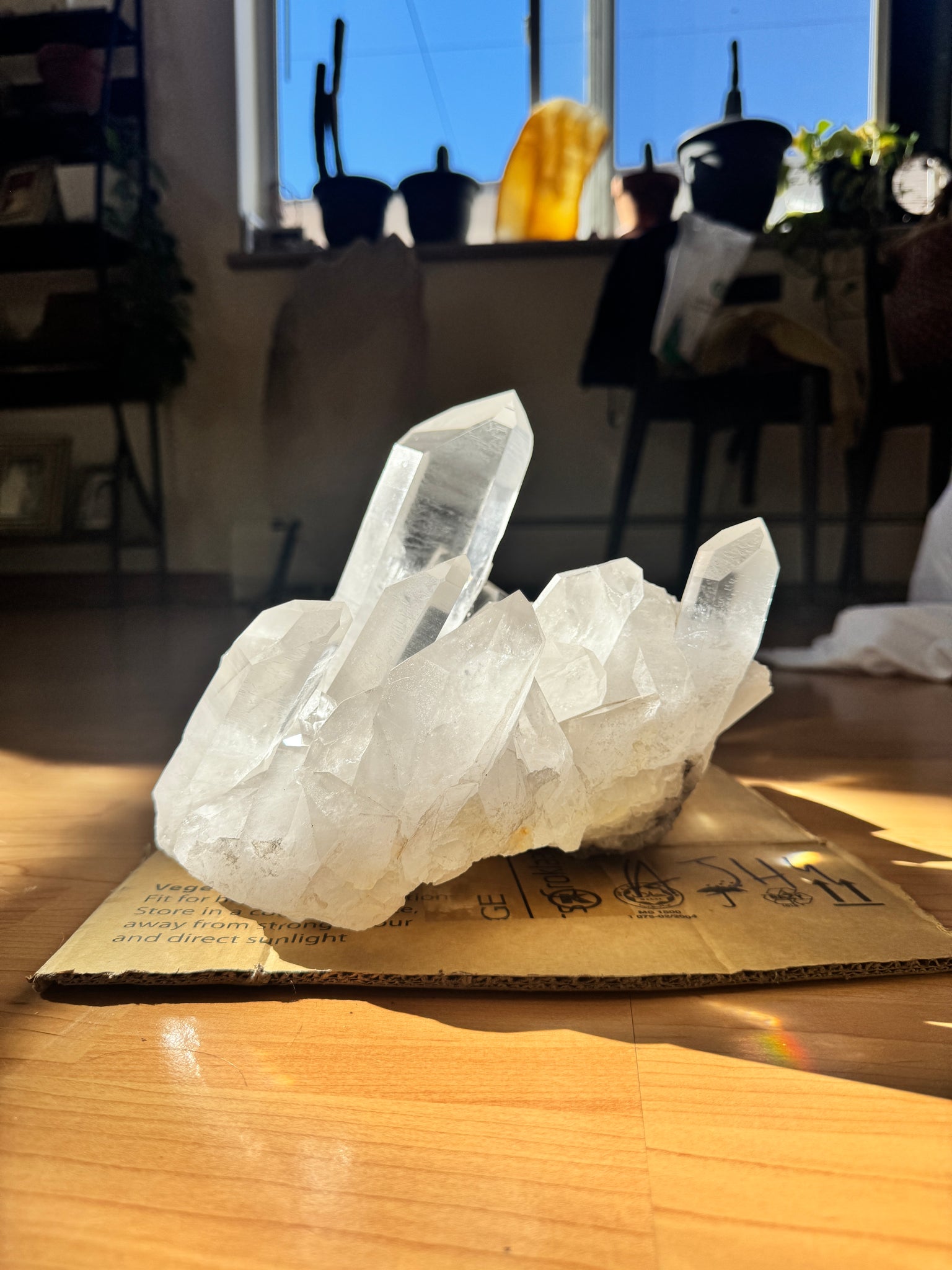Quartz  is the most powerful healing and energy amplifier on Earth.  It absorbs, stores, releases, and regulates energy, and is excellent for unblocking it.  It is a deep soul cleanser and puts you in alignment with your spiritual purpose. When used for healing or spiritual work, it works at the vibrational level attuned to your unique energy needs. Helps you concentrate and unblock memories.  Amplifies your intentions, as well as amplifies the power of any other crystals.  Approximately 15.65 lbs, 18x14x8. **cat not included**