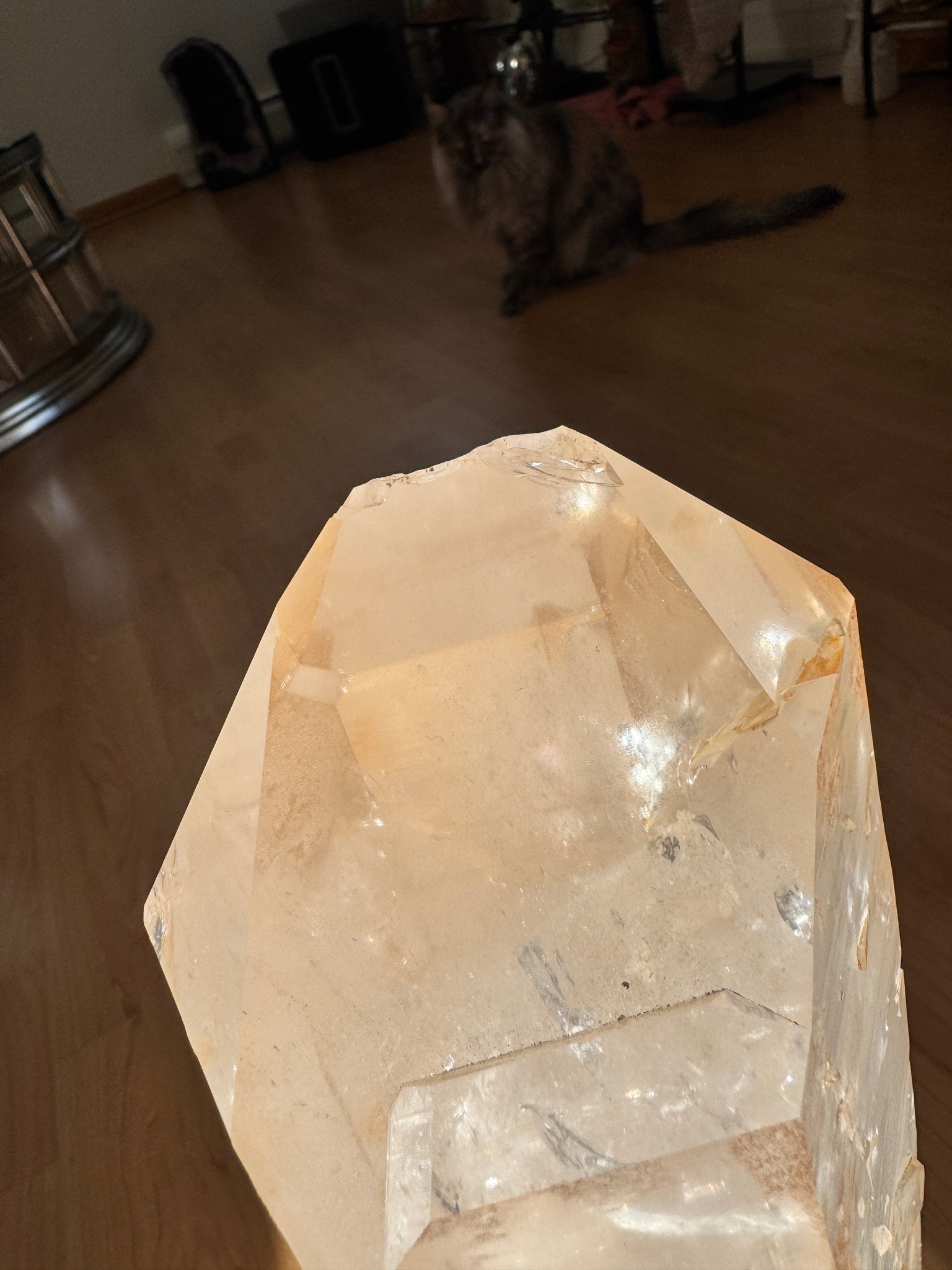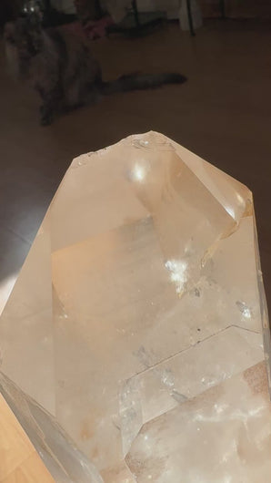 Tangerine Quartz is believed to carry a vibrant, uplifting energy that promotes joy, creativity, and confidence. Many people associate it with the sacral chakra, linking it to emotional healing, passion, and motivation. Tangerine quartz is also thought to help release fear and past traumas, encouraging a sense of playfulness and curiosity about life. Its warm, radiant energy is said to inspire self-acceptance and help one move forward with optimism and enthusiasm. Approximately 12.5 lbs, 13.5x5x5 inches. Comes with stand (19" H w/stand). **price reflects slight damage to point - see video**