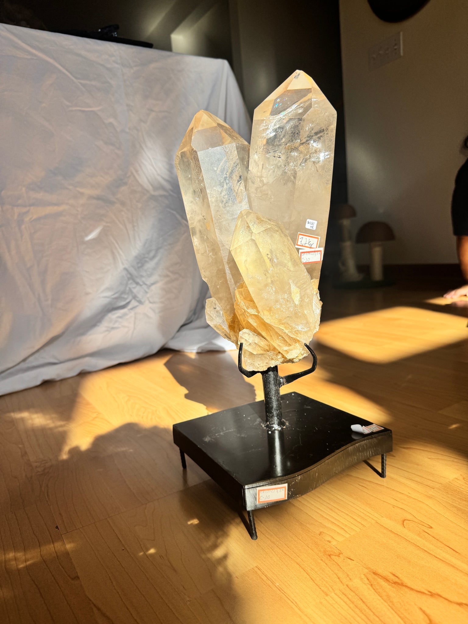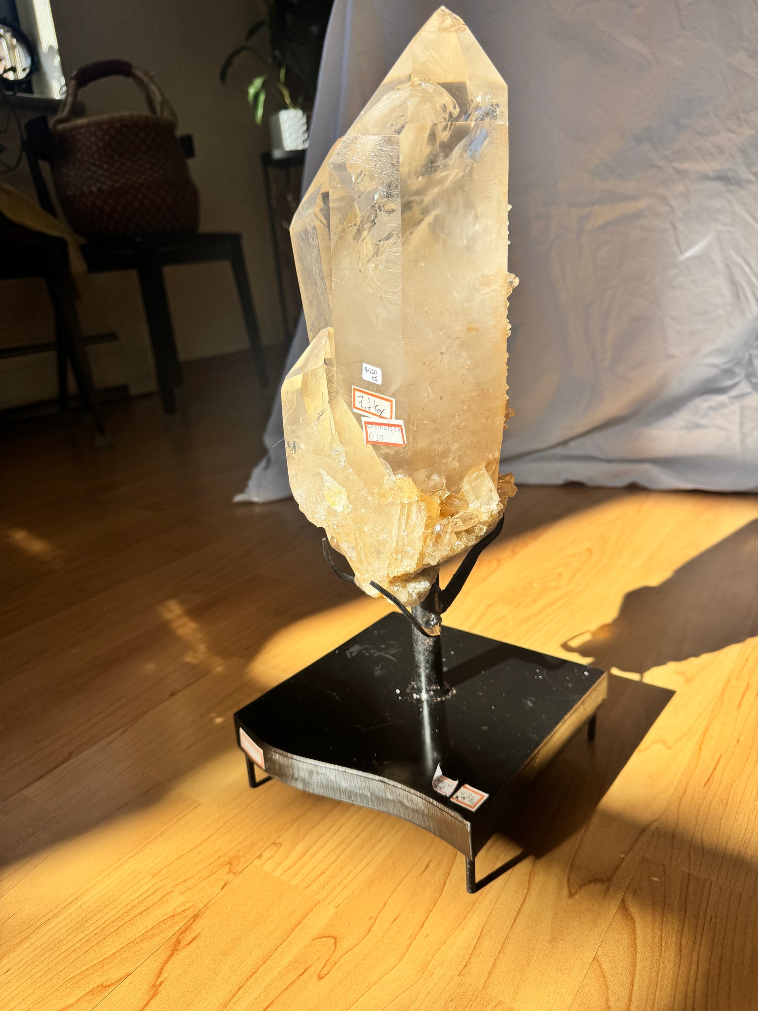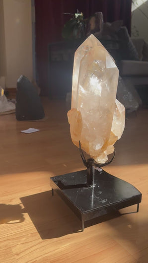 Tangerine Quartz is believed to carry a vibrant, uplifting energy that promotes joy, creativity, and confidence. Many people associate it with the sacral chakra, linking it to emotional healing, passion, and motivation. Tangerine quartz is also thought to help release fear and past traumas, encouraging a sense of playfulness and curiosity about life. Its warm, radiant energy is said to inspire self-acceptance and help one move forward with optimism and enthusiasm. From Diamantina, Brazil. Approximately 16.16 lbs., 13x6x4 inches. Comes with stand (17" H w/stand). **price reflects slight damage to points - see video**